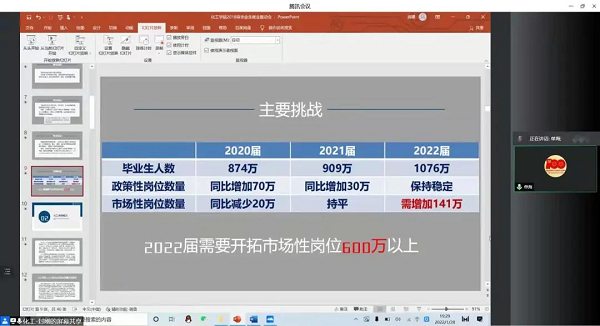 会议首先由封刚从就业规模、就业环境、就业机制、就业机构、就业观念和主要挑战等方面进行详细传达了全国就业工作会议精神,并结合具体就业数据为大家分析了当下严峻的就业形势,展示了2021届毕业生的整体就业情况、目前2022届毕业生阶段性就业数据,为同学们提供了参考数据;结合2021年秋季学期我院的就业工作内容,从平台建设、点面帮扶、校企联合、班导师引领等方面介绍我院促进就业的举措,针对不同的就业方向提供精准指导,助力同学们及早踏上求职之路。