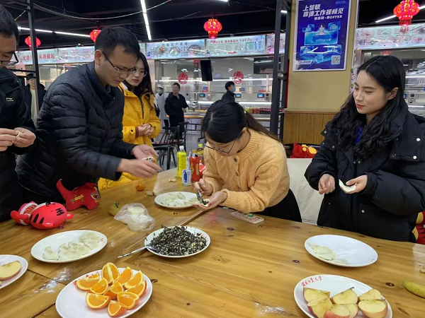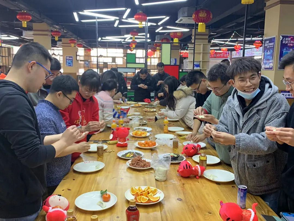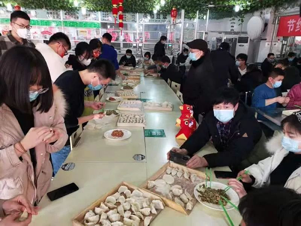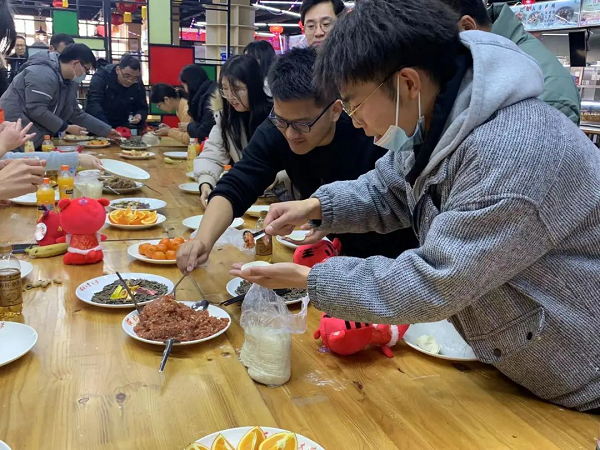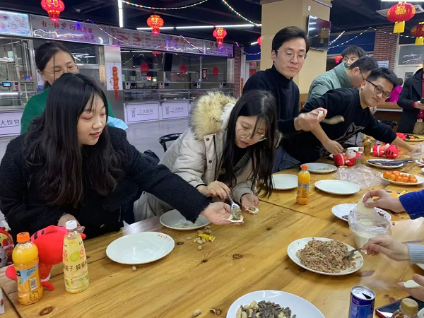 下午5点30分,热气蒸腾,蕴含着吉祥喜庆的饺子出锅,口感鲜美香味扑鼻。师生们纷纷吃着热气腾腾的饺子,展望未来,无不心有所期。天南地北的美食摆满一桌,师生团聚,围坐桌旁,满满的都是过年时最重要的仪式感。